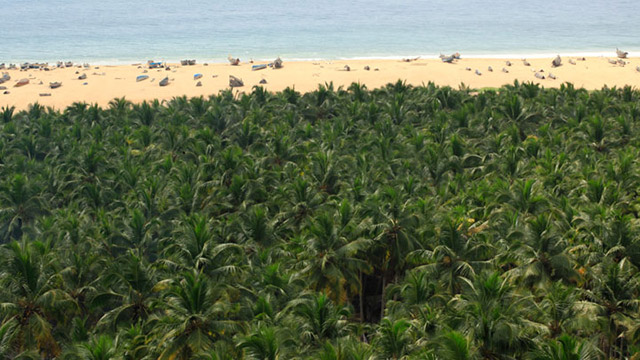 This beach is inside a small village called Vallikunnu. It is surrounded by a group of thick coconut trees and has a few shacks in front of it.